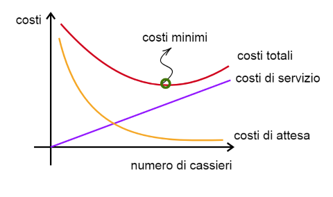 Rappresentiamo in un grafico il numero di cassieri nell’asse orizzontale e i costi nell’asse verticale. I costi di servizio Cs aumentano linearmente al crescere del numero di cassieri e sono i loro stipendi (linea viola). I costi di attesa Cw (i mancati guadagni) sono molto alti se la fila è molto lunga perché ci sono pochi cassieri e diminuiscono molto velocemente se le casse riescono a smaltire i clienti senza troppe attese (curva gialla). I costi totali sono la somma dei costi di servizio e di attesa (curva rossa). La condizione ottimale è quella dei costi totali minimi che accontenta tutti, a cui corrisponde il numero massimo di cassieri al minimo dei costi.